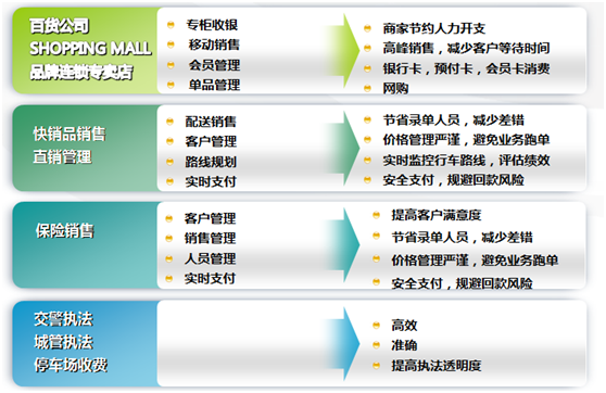 移動(dòng)POS可以布局于百貨購(gòu)物中心和SHOPPING MALL 專柜,在專柜完成銷售和收銀,這樣可以有效的減少高峰銷售的壓力,提高銷售額,可以有效減少集中收銀的數(shù)量,從而大幅降低運(yùn)營(yíng)成本。專柜單品管理有利于線上線下業(yè)務(wù)的打通,從而開(kāi)拓網(wǎng)購(gòu)業(yè)務(wù)的新局面。