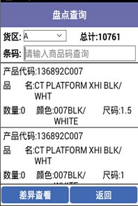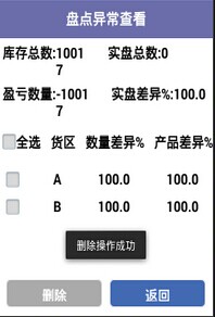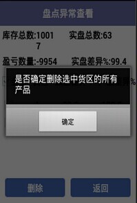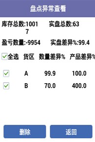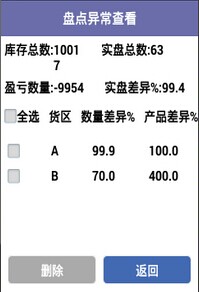 點(diǎn)擊差異查看按鈕顯示出:庫(kù)存總數(shù),實(shí)盤(pán)總數(shù),盈虧數(shù)量,實(shí)盤(pán)差異和各個(gè)獲取對(duì)應(yīng)的數(shù)量差異和產(chǎn)品差異。選中某一個(gè)貨區(qū)可以進(jìn)行刪除。