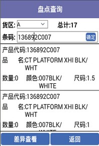 點(diǎn)擊查看報(bào)表,則顯示盤(pán)點(diǎn)查詢界面,顯示出具體掃描過(guò)的商品的數(shù)量顏色和尺碼,還可以在條碼框中輸入條碼進(jìn)行搜索查看。