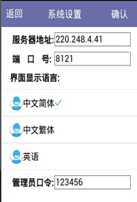 點(diǎn)擊系統(tǒng)設(shè)置按鈕,輸入口令(即密碼)123456然后點(diǎn)擊確定,進(jìn)入系統(tǒng)設(shè)置界面,可以設(shè)置服務(wù)器地址,端口號(hào)和界面顯示的語(yǔ)言。設(shè)置完成后點(diǎn)擊右上角的確認(rèn)按鈕。